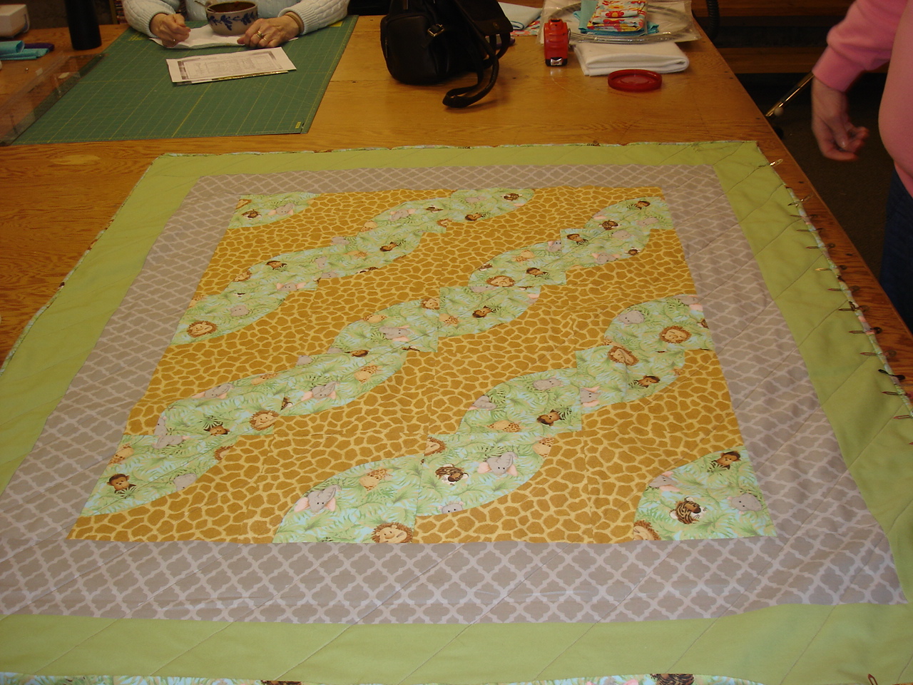 Bev, below, was hand hemming her baby jungle themed quilt.